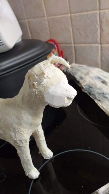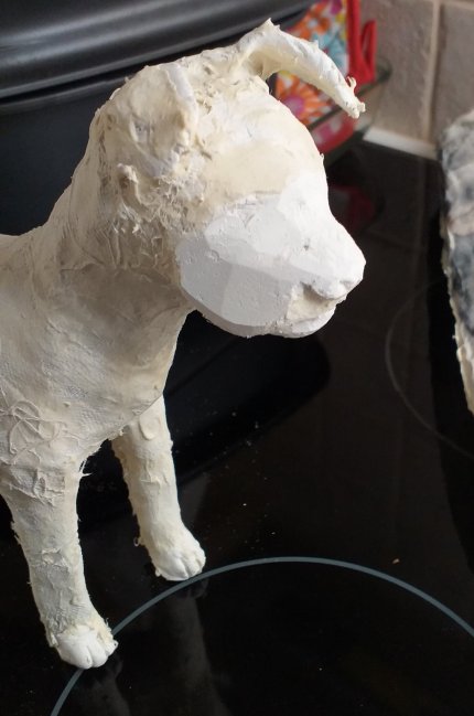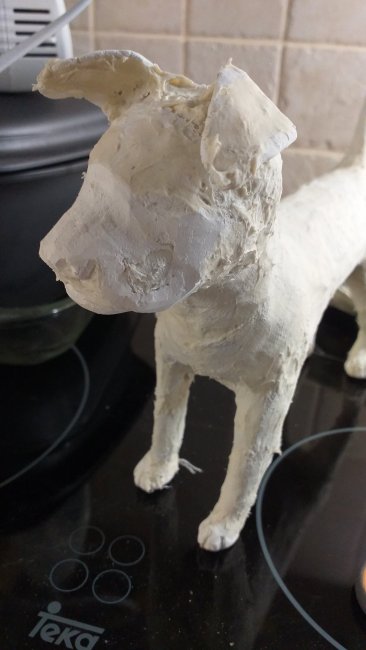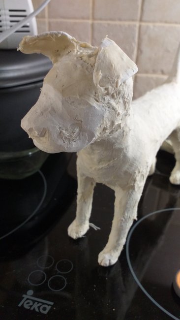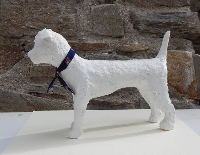 Another finished dog. I just love making these guys. They take about a week to make. Making the armature is easy enough and only takes an afternoon. Then the actual shaping (building up of body) and adding face and paws takes a few days since they need drying time between goes. Because of that I usually start another dog before I’ve finished the one I’m working on. At any given time I have at least 2 dogs ‘in progress’.