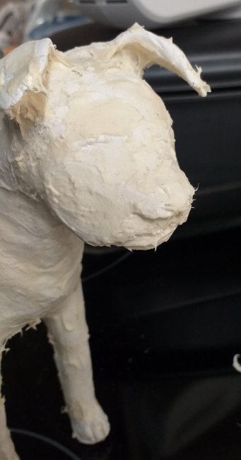 Anyway, this little dog began life as a short muzzled boy, but when I added cheeks and jowls he looked like he’d been stung by a bee. I began thinking I’d put a bee on his nose and call him ‘I got Stung’ but discovered I could carve into the paper mache clay. I fixed his face and now he has this quizzical expression I really like.