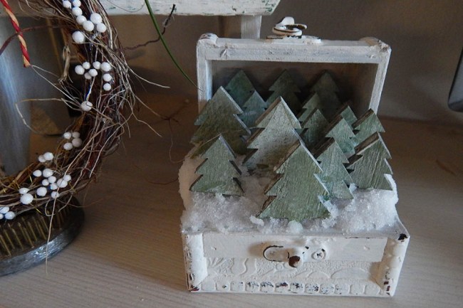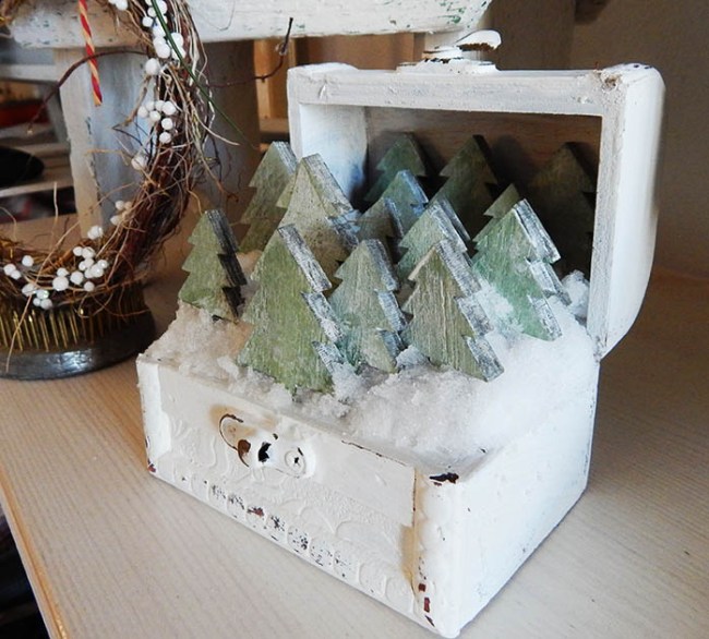 I used hot glued the trees into the back of the lid. I cut a toilet roll to create a hill in the foreground and hot glued trees to that. I topped it all off with some ‘just add water’ snow cause the dry snow would just blow off everywhere. This should last till after Christmas… Next year I’ll upcycle it again.