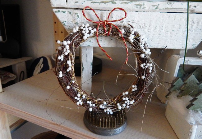 I also made this little wreath. I’d already started this one day at the beach. Those trees that grow by the sea have lots of very fine roots close to the surface that sometimes stick out of the sand. They’re thin and flexible so I’d pulled up a few and wrapped them into a ring using a bit of gold wire to secure them.