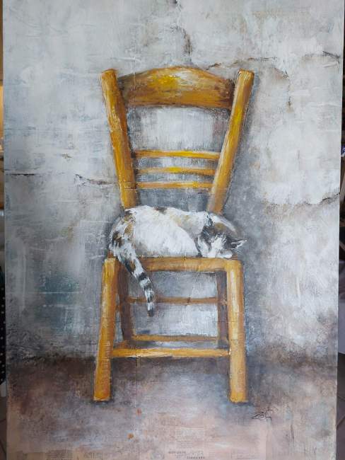 For the chair and the cat, I had to add more detail and form, so I used a brush as well as a palette knife. Its nowhere near the kind of detail I normally put in my work (despite spending years combating my tendency towards perfect imitation of life) and I am really pleased with the result. I’ve always admired artists who can paint something so real without actually describing it in detail. The impression of detail is enough, our mind fills in the rest.