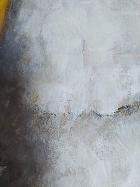 This is a large piece, almost a meter high, much bigger than anything I’ve ever attempted before in acrylic. I’m not currently on Paros, so can’t give exact measurements. I used a recycled canvas of some kitch island art destined for the trash, which unfortunately had some tactile elements, so the first thing I did was to eliminate that texture by covering the surface with vintage book pages.