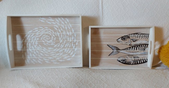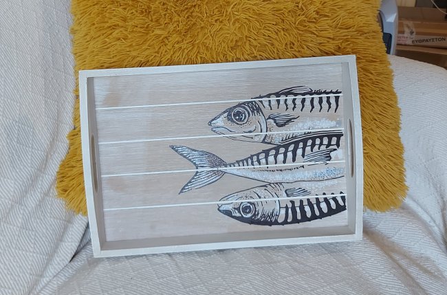 Wooden tray 40cm x 30cm, white washed, oil paint, varnish. 35 euros.