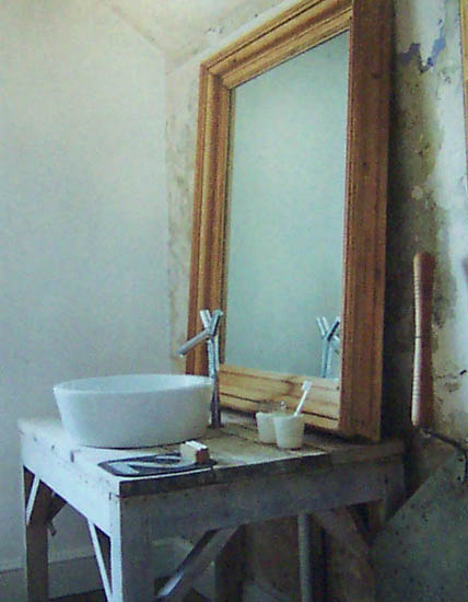A weathered old table, a new sink & mixer tap, an old framed mirror stripped to bare wood create a rustic feel in this bathroom. Gotta love that combination of new and old.
