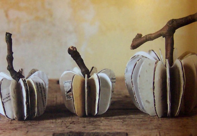 Love these handmade apples made by artist Eiko Yoshida, using twigs, recycled paper, magazines, envelopes (complete with stamps) and corrugated cardboard.