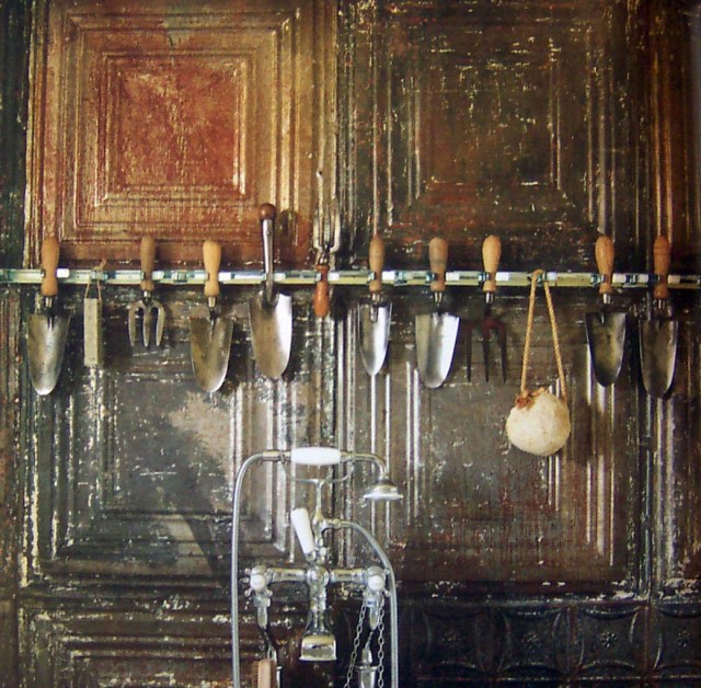 This bathroom wall made from vintage ceiling tiles holds a collection of vintage garden tools. I just love collections of things. I have a few collections and I’m always expanding the number of collections and the collections themselves. So far, of course, the hands-down winner is the poodle collection. I don’t think any of the others stands a chance against the poodles.