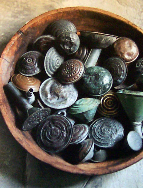 A wobbly handcrafted bowl holds a wonderful collection of old coppy and brass watering can roses. Now I feel the need to find and collect watering can roses!