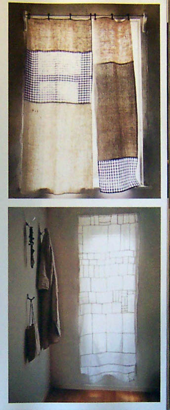 Below, gorgeous simple curtains made from stitching together natural linen towels with pieces of gingham for a bit of colour. And a curtain made from pieces of sheer fabric sewn together in a graphic pattern to form a sheer curtain which allows filtered light into the room.