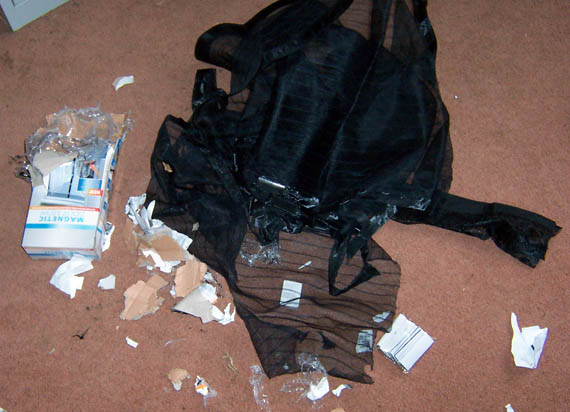 Yep. That was the new, still in its box, magnetic flyscreen I bought to try out on the outside door. And yep, Barney got bored and ate it.