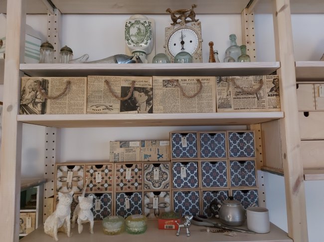 Meanwhile, I’m keeping my little cubby boxes and drawers, and I’ve added another 4 drawers to the bookcase for all the tools and odds and ends. I found these little boxes at Jumbo the other day and bought 4 of them.