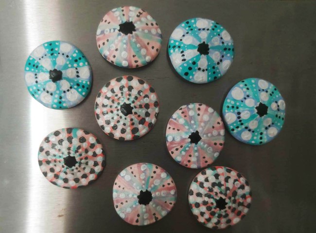 I had some more of these round flat pieces so I did some more simple colourful sea urchins.