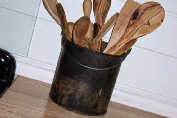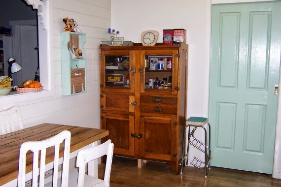 And here it is in the kitchen, ugly cords hidden, Mickey, Mini, Wilma and Barney back in their spots. Plus a rusty wire flower Wayne made me.