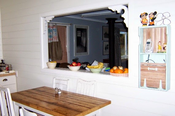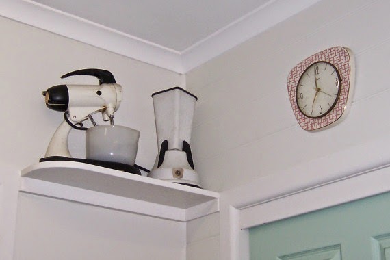 Here’s a photo of the ‘pre’ kitchen and you can see how I dealt with it before. An old drawer, with a hole cut out to expose the phone jack, held the phone, a framed print of a rabbit (cause why not?) and some of my 50’s collectibles.