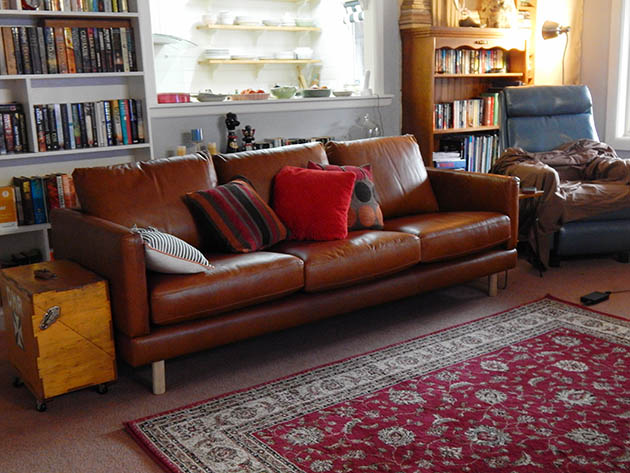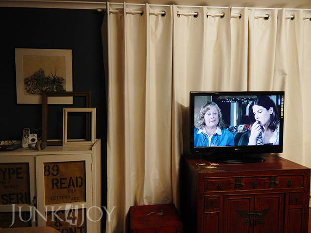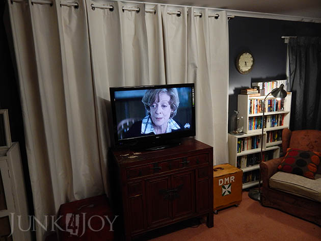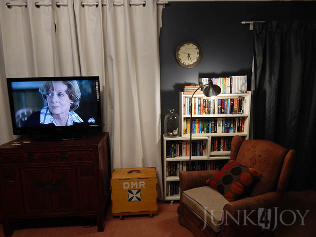 Meanwhile the coffee table is a craft station. I still haven’t recovered the dark brown cushions, I want to cheer the place up a bit. I did make the round cushion cover removable using fabric scraps I had on hand so it can be washed.