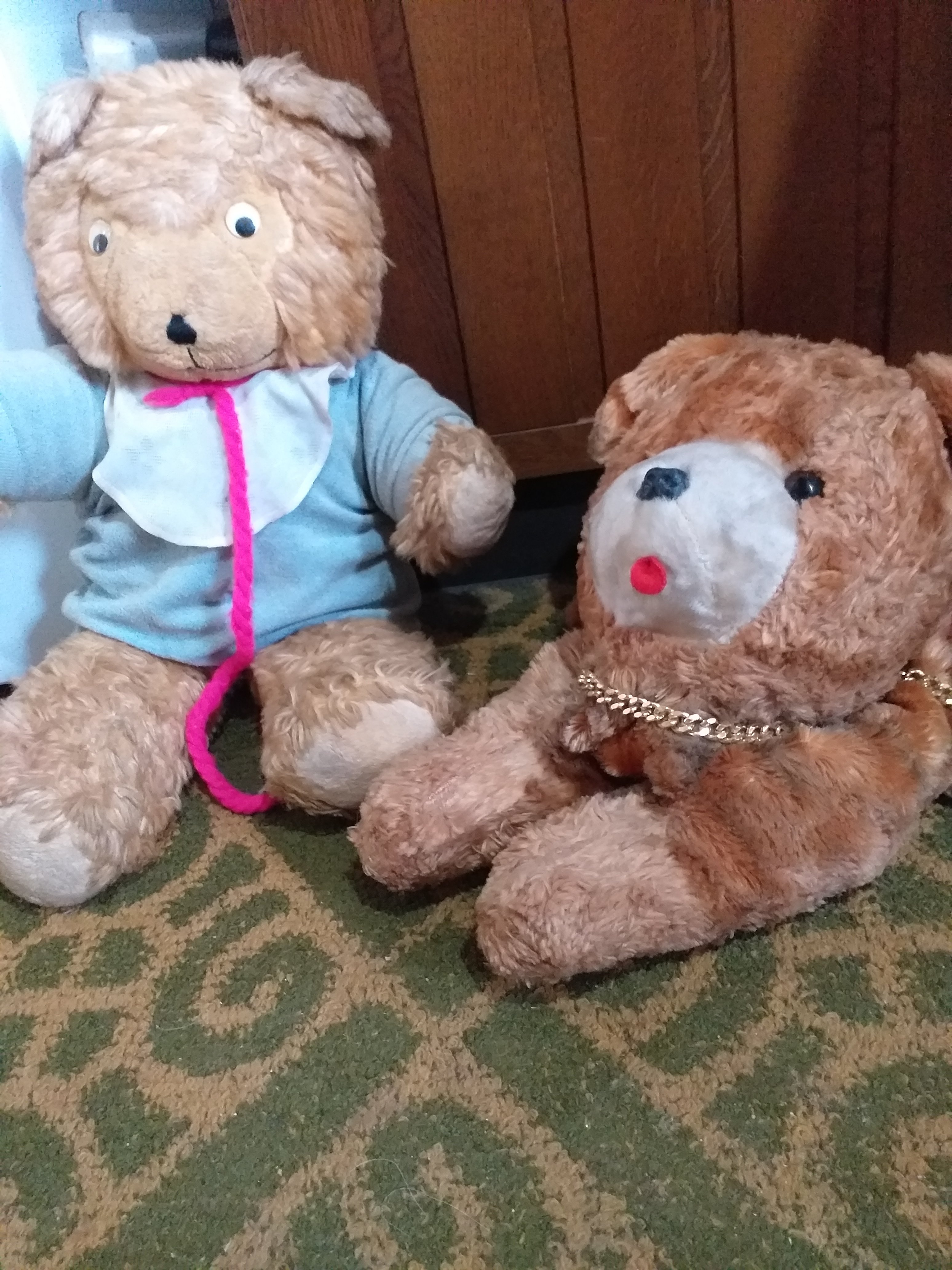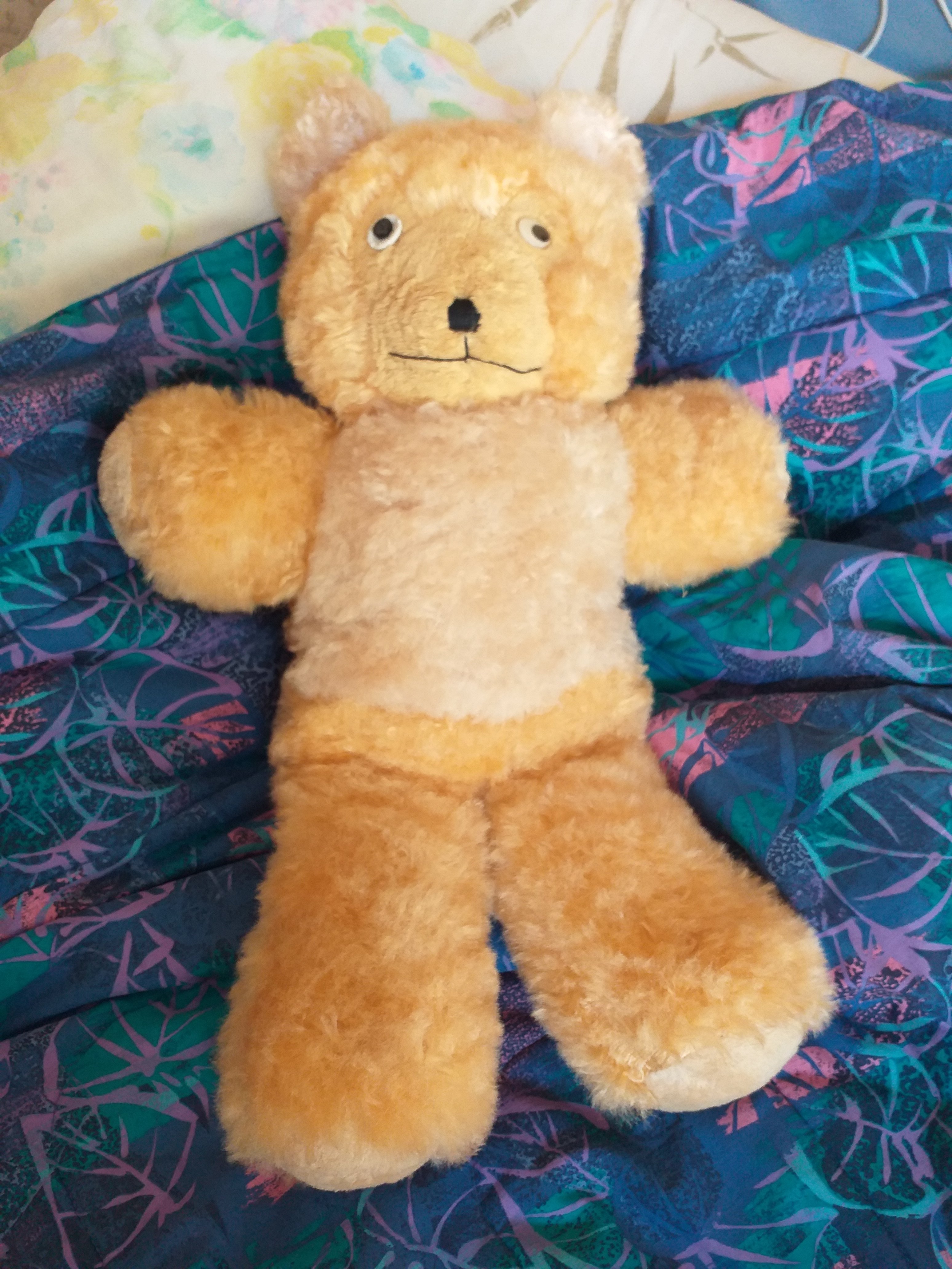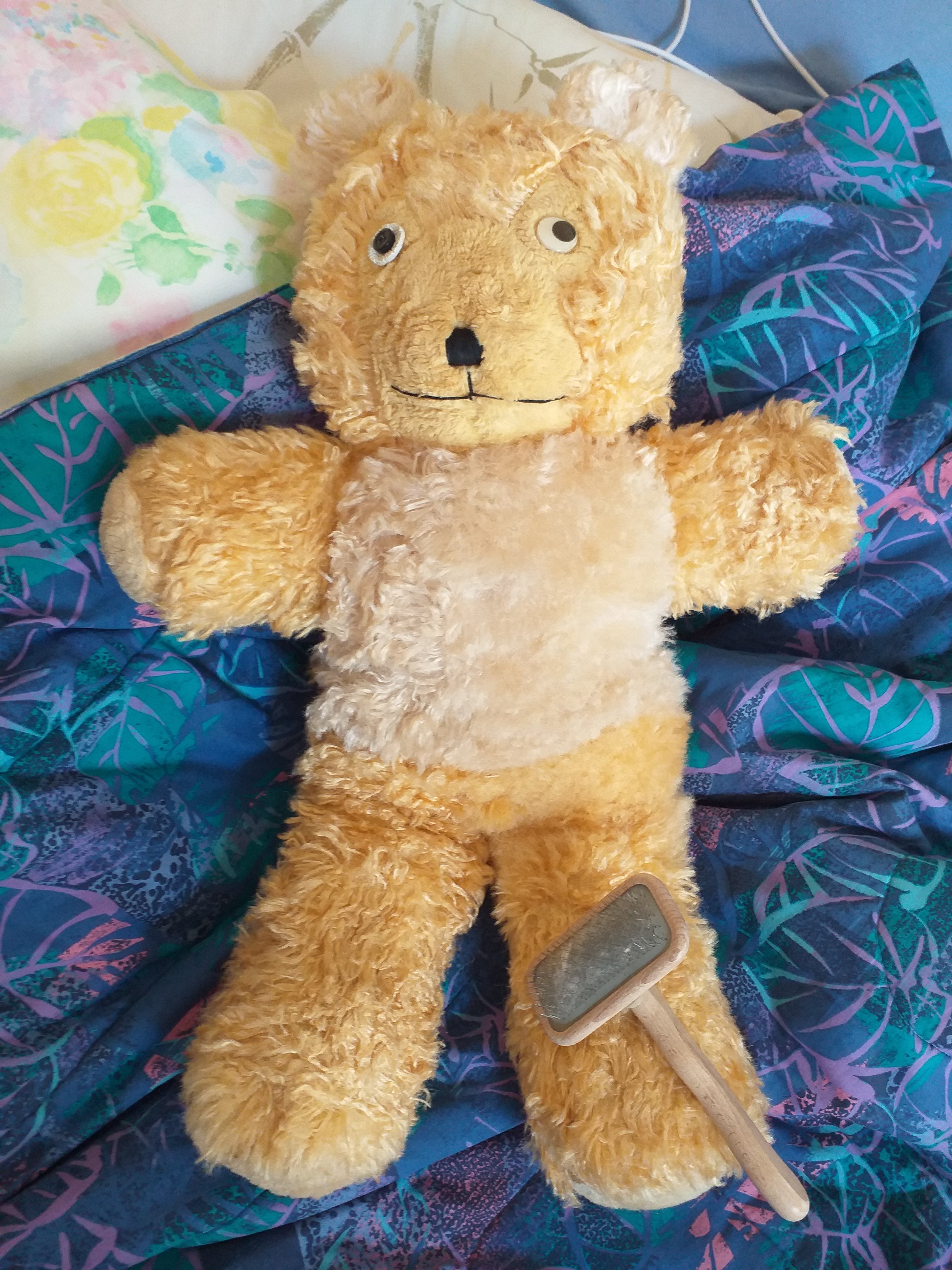 Remember the teddy bear I found in the roof space above the hallway? My first ever teddy bear, Charalambis? Pictured here with pyjama puppy Bobby in all their grime?