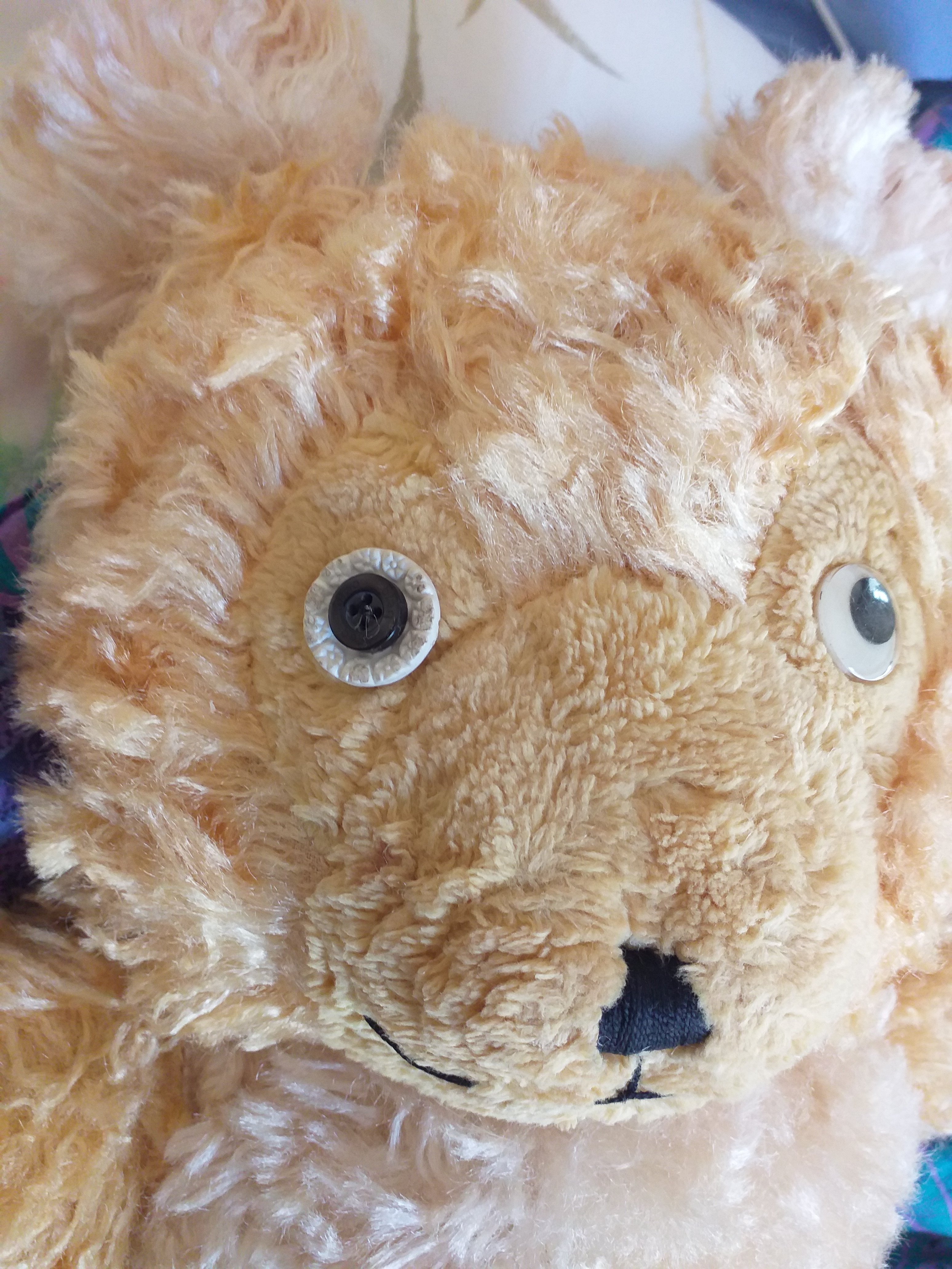 Well, I put them both in the washing machine (without putting them in a pillow case first) and they suffered some minor damage. At least teddy’s was minor. He only lost one eye. But yesterday I got to work on restoring him. I created a new eye for him using two buttons and I think it looks pretty good.