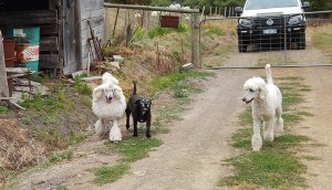 Today was a busy day. And a fun day. Our friends Mary and Zephyr came over for a visit (and grooming session). Usually when Zephyr comes over to play we all go out for a walk in the top paddock which has the best view on our property. Then, once the poodles are nice and dirty, we go back and they all get a groom.