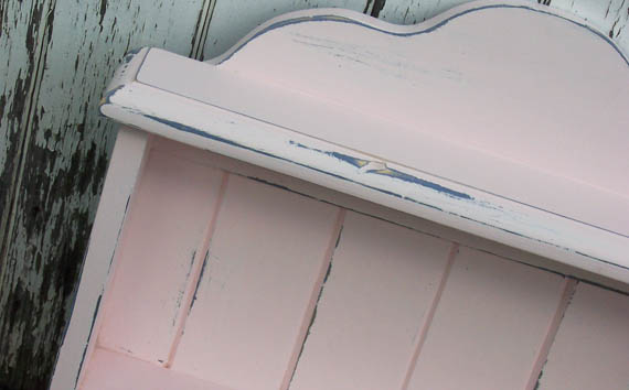 The pink is a colour I mixed up myself using paints I had on hand. It turned out to be the softest, sweetest pale pink. When I distressed it I varied the depth so that you could see both the original wood and the previous paint layers.