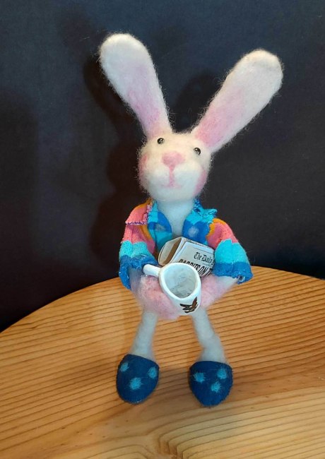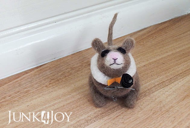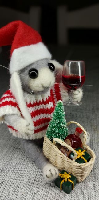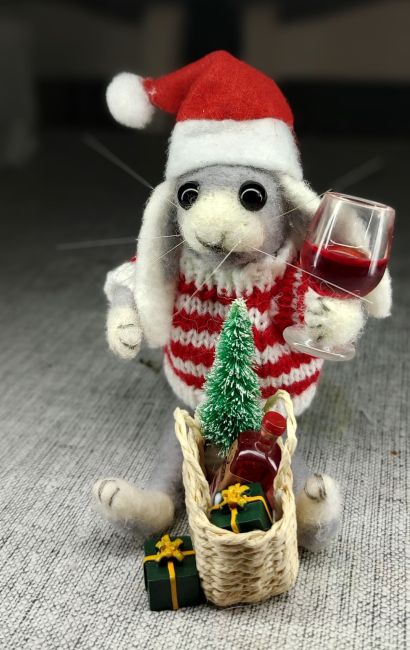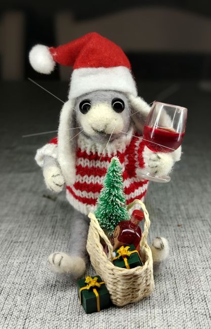 I especially love creating little creatures with personalities, giving them more character by adding accessories to tell a story. This little bunny, for instance, started his gift wrapping full of Christmas spirit, but found he needed a big glass of red wine to get through it.