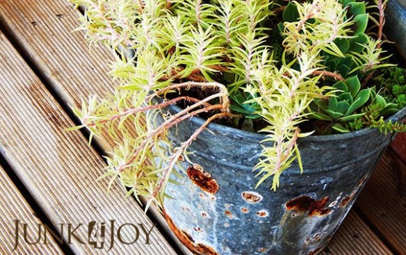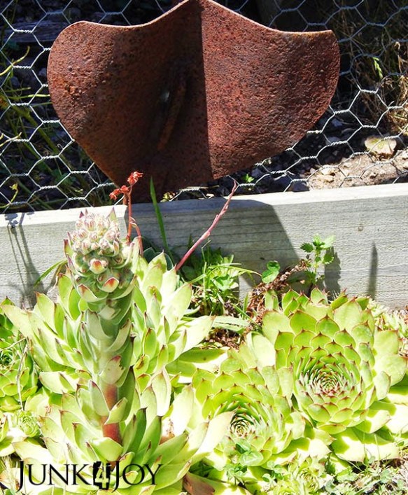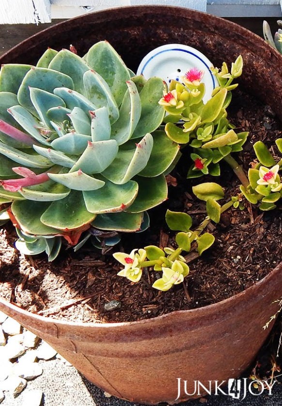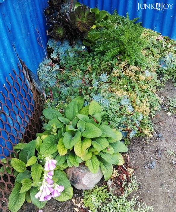 The old wood heater from the shed is now a home for many succulents, on top and inside.