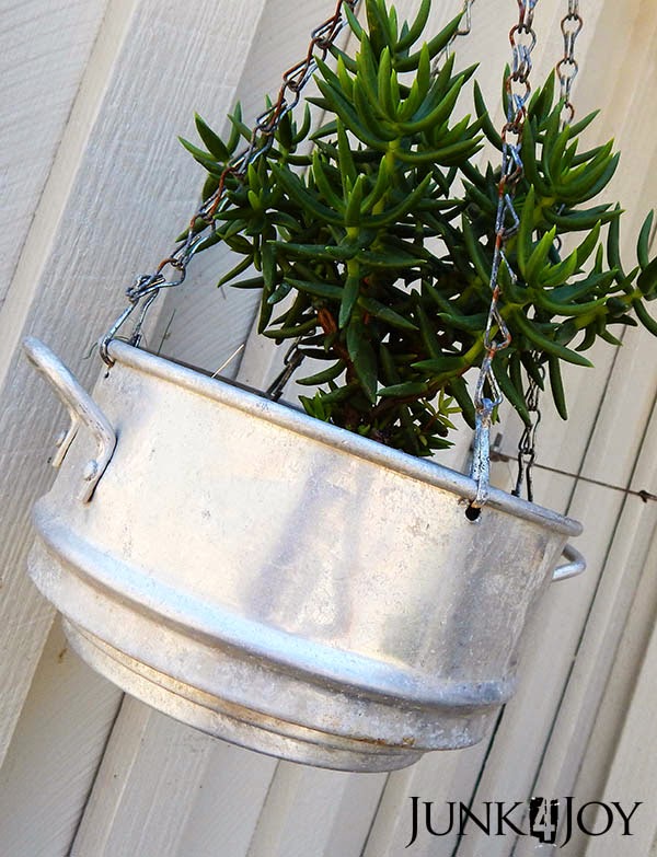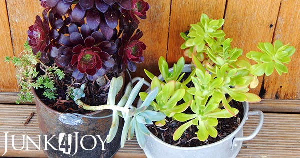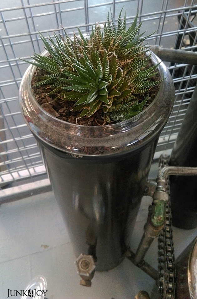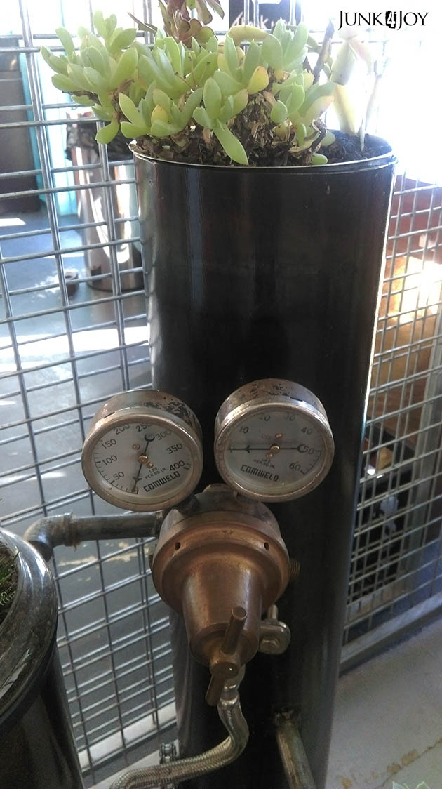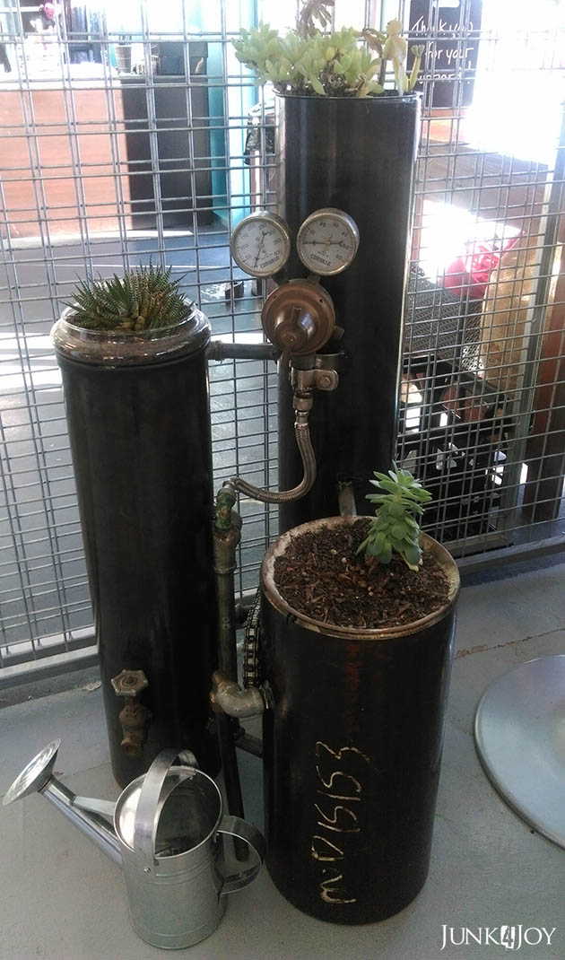 The old wood heater from the shed is now a home for many succulents, on top and inside.