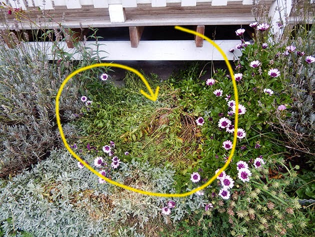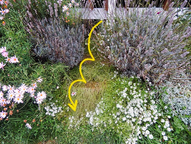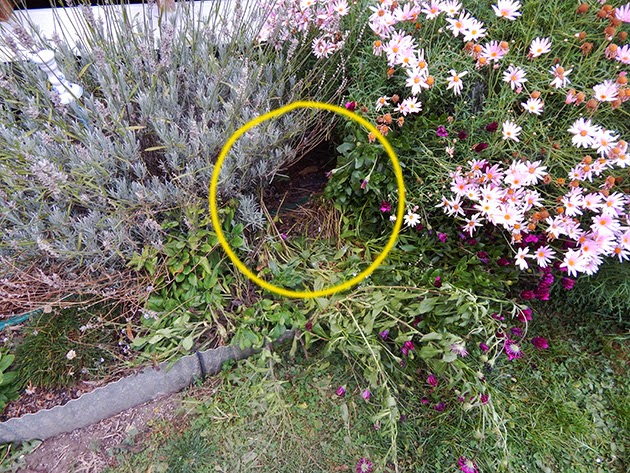 Flattened osteospermums and a hole between the english lavender and the pink daisies.