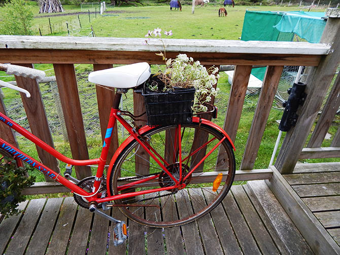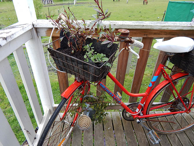 The front basket got a gaura which was growing in a pot – it was a cutting… well, a broken branch from one of the established plants. I added a bit of catmint for its trailing propteries. Both of those are doing well, though the gaura will need to be moved as its way too big for a bike basket.