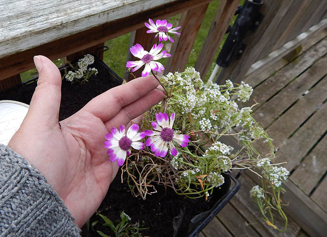 The snow in summer is looking scraggly but that should be ok. And the osteospermums should bounce back. I’ll just give them a trim, I have to do for winter anyway.