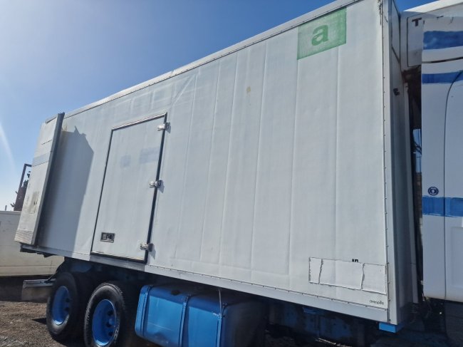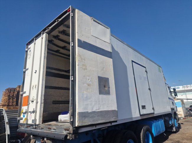 Its an ex-refrigerated container with lined walls inside and a side door as well as the back doors. And a big hole where the refrigerator unit used to be – ie a window! (sort of. up high.)