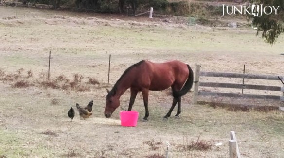 Here’s Waldo, sharing his breakfast with the chickens. I give Wally a wide berth… after the time he bit me I’m very wary of his teeth.