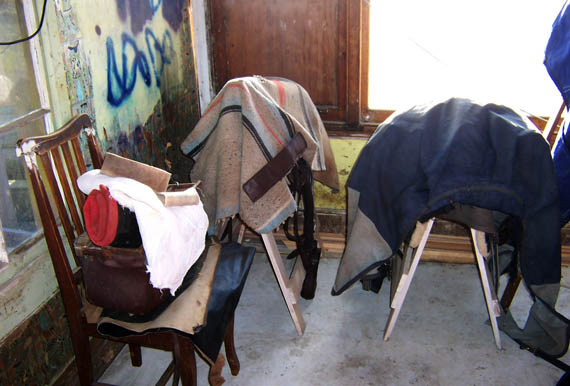 (The saddles are covered to keep bird poop off them as well as to protect them from the sun streaming in through that window despite its liberal coating of grime. Yes, we have birds living in the casita. And mice, and rats. And a black possum named Siegfried.)