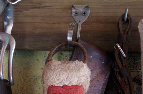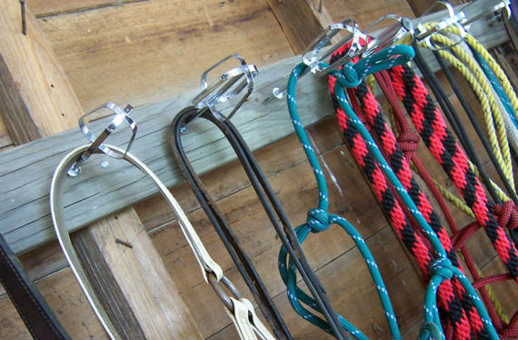 Another slat became a spot for girths and older tack, not so regularly used. Since I have no idea where the studs are behind the masonite wall I thought it’d be safer to put a slat of timber on the wall for my hooks. I used anything I could find as hooks. More photos of those later.