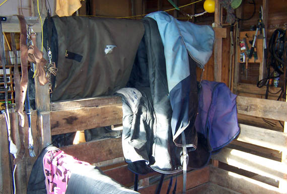 I had something which looks like the side of a playpen so I attached it to the dividing fence, its now another spot to hang a horse rug. We only have 2 horses right now but we have something like 6 rugs. They’re all in varying degrees of repair (or disrepair).