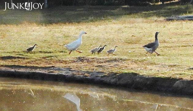 Coming up behind is Annabelle (our original female goose) with her 4 babies and Hank. When Annabelle hatched out these babies she abandoned them for a while and Hank raised them on his own. What a guy!