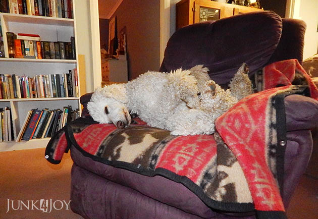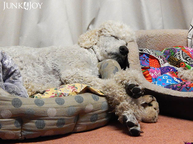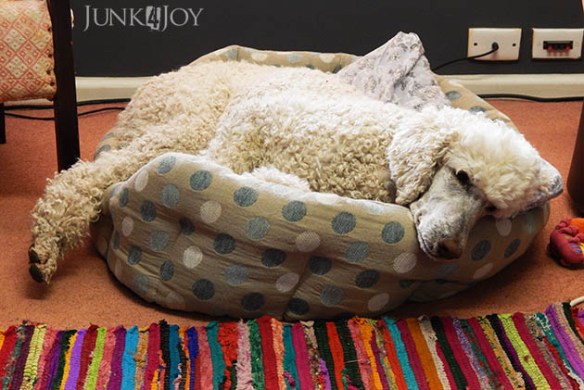 | Montana squeezing into the smallest of the dog beds. |