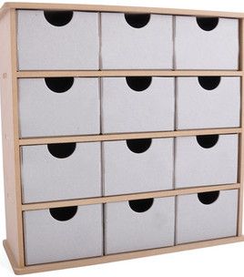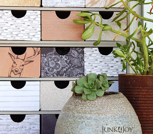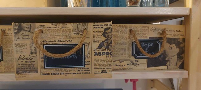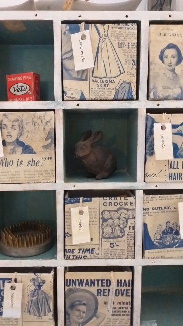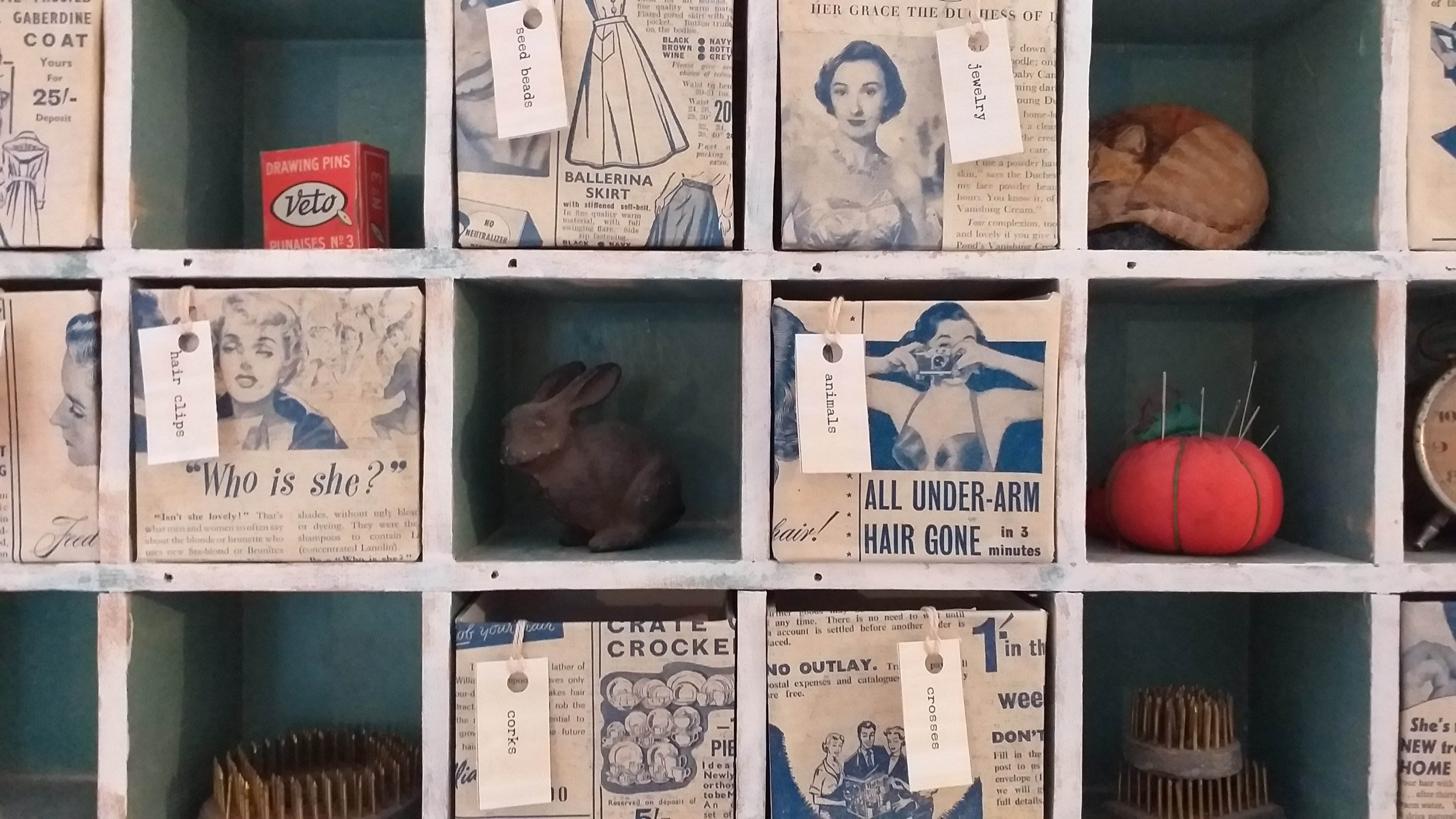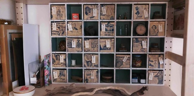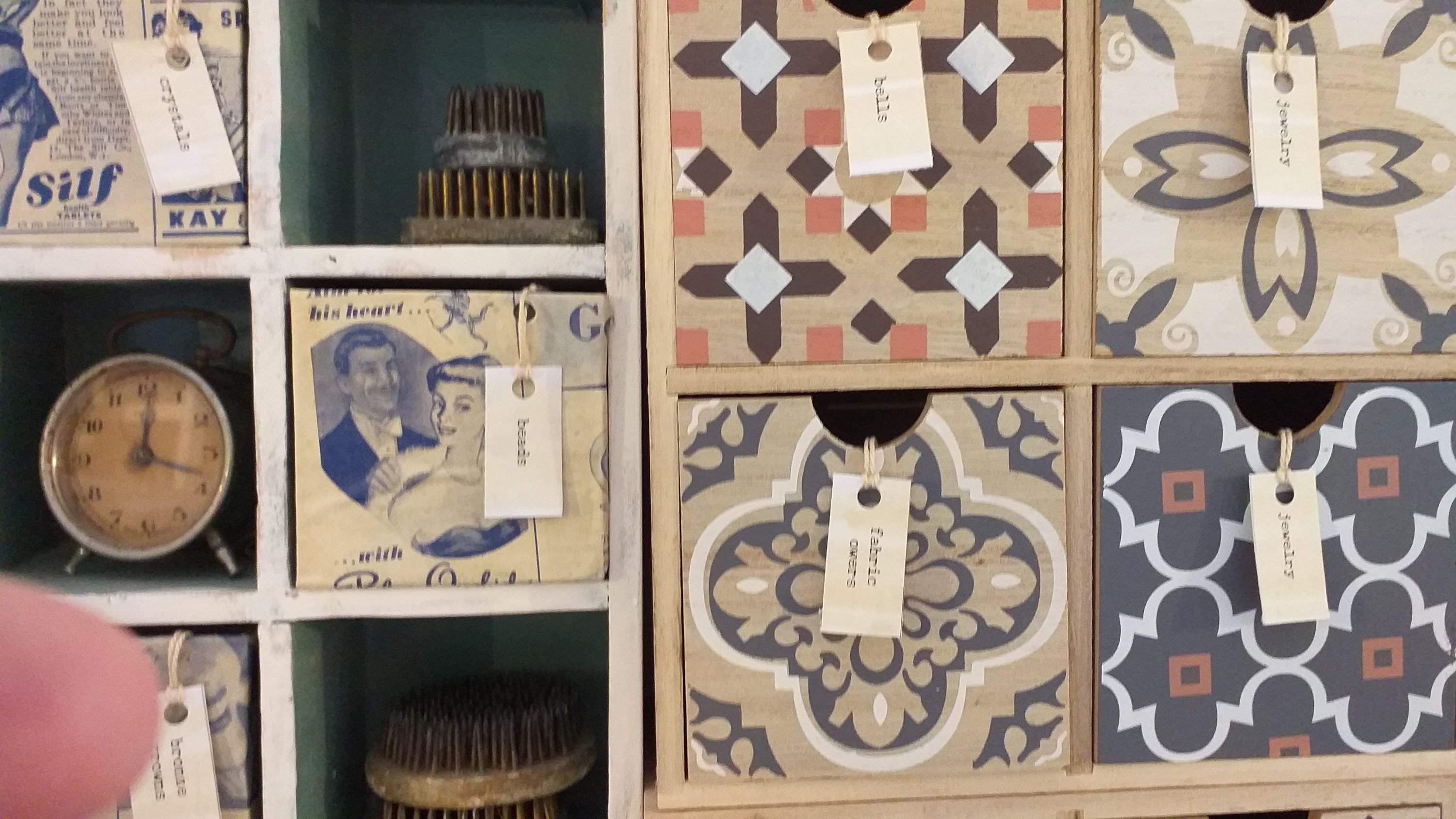 And then there’s my gorgeous hotel reception key cubicle thingy I bought at an antique shop a few years ago, removed the room numbers, painted the front white but kept the inside of it blue. Then, using some thick cardboard, I made little boxes to act as drawers for all kinds of small items like various sized and type of beads, brooch pins, pegs, acrylic shapes, whatever I might need at some stage. Of course, these are mostly winter project materials. Little labels tell me what’s in each box so I don’t have to go searching.