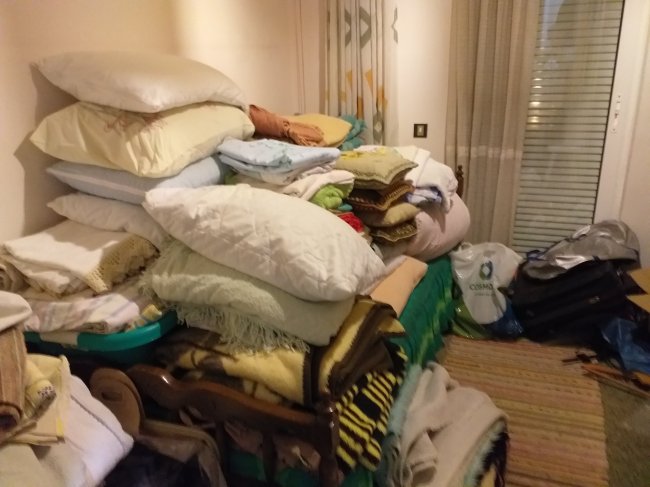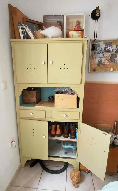 On the other side of the room is the kitchen dresser I made over which holds my linen up the top and boots and grooming stuff in the lower sections.