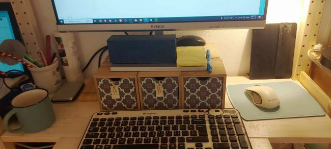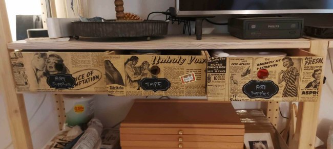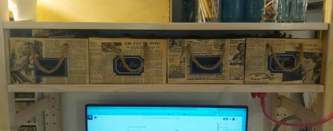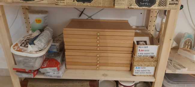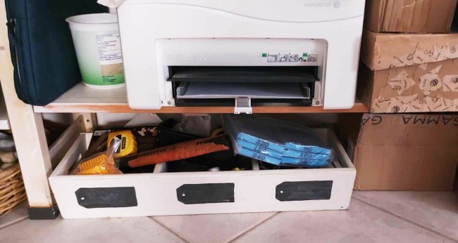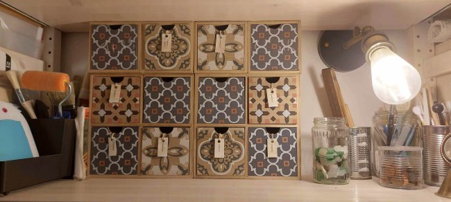 Under the shelf that holds the printer I have a box which holds tools I need to keep in easy reach – a hammer, some nails, some screws and screw drivers, some sanding pads, a box cutter, etc. Next to the printer is a shoe box decoupaged to hide electrical cables. And a spare box, cause who can resist keeping ‘good boxes’… sigh. My excuse: when I do sculpture workshops, I need small boxes to pack the finished figures into for the participants to take home.