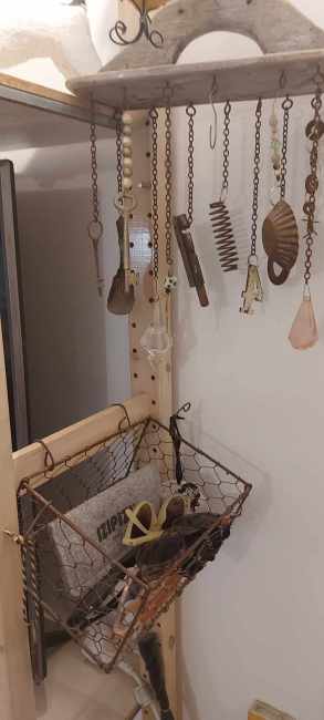 I have a beautiful antique hat and coat hook where I hang all the aprons for sculpture workshop participants. Next to that is the cabinet I made over that holds towels.