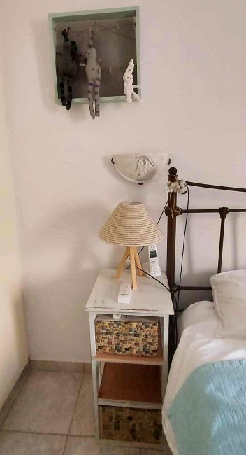 In my bedroom, the bedside table is a little shelf unit I found in bad need of some TLC. Its baskets were rotten so I put in shelves and then made a couple of boxes to hide electrical cords and other bedside stuff. The middle shelf houses my modem… Not the best place for it, but its the only phone outlet in the house.