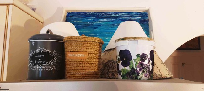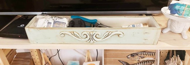 In front of the TV, I have the drop box I made for my kitchen in Tasmania. Its there for anything I want to grab before I head out the door… plus a pair of garden trimmers cause I’m constantly losing them. And I don’t even have a garden!