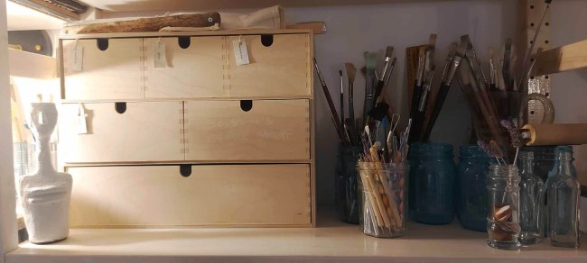I made these 3 drawers to fit in the bookcase for added storage. These hold my water colours, all my tape and my oil paints. Turns out I enjoy making box/drawers!