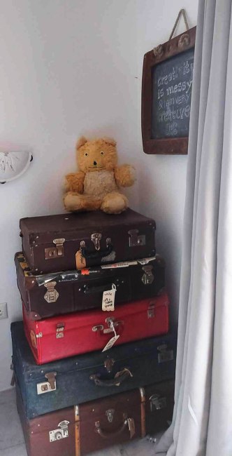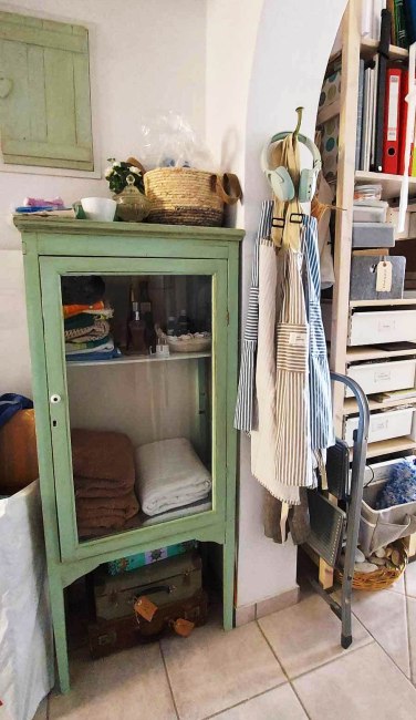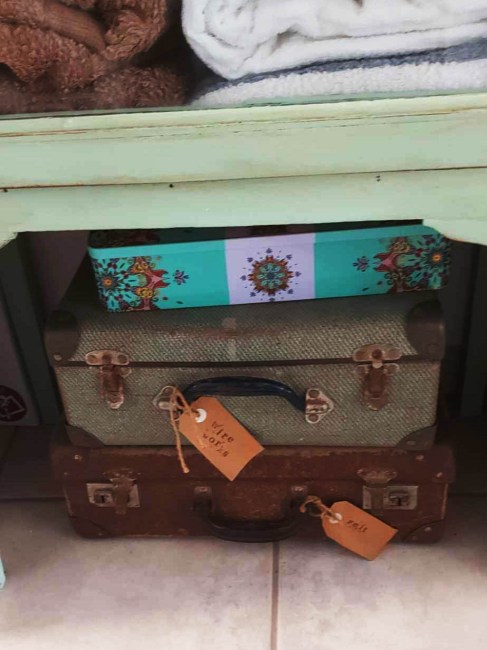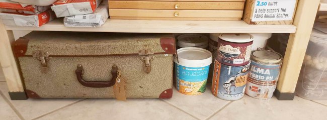 I have a million suitcases of all sizes, they’re ideal for pretty storage. A small one under the TV holds supplies for my workshops. And larger paint tins next to that. I really don’t like all these in the house, but it gets so hot outside in my outdoor cabinet that I worry the contents will dry out too fast.
