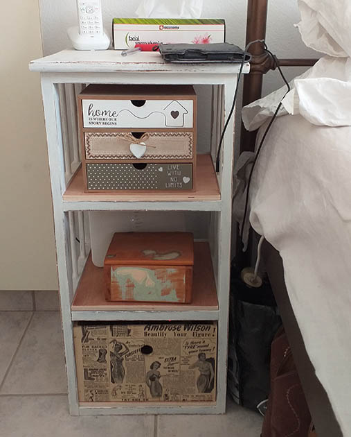 In the bathroom…In the bedroom…In the living room above the sewing machine table, next to the old hotel reception cubbies…On the bookcase to hold office stuff…