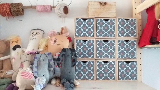 When I say I’m not finished yet I mean I haven’t filled them all yet, plus I’m not sure if I’ll keep them all as they are or paint over the patterns, even just to fade the colours a bit. We will see. For now I think I’ll just make some simple labels so I dont have to open every single cubby when I’m looking for something.
