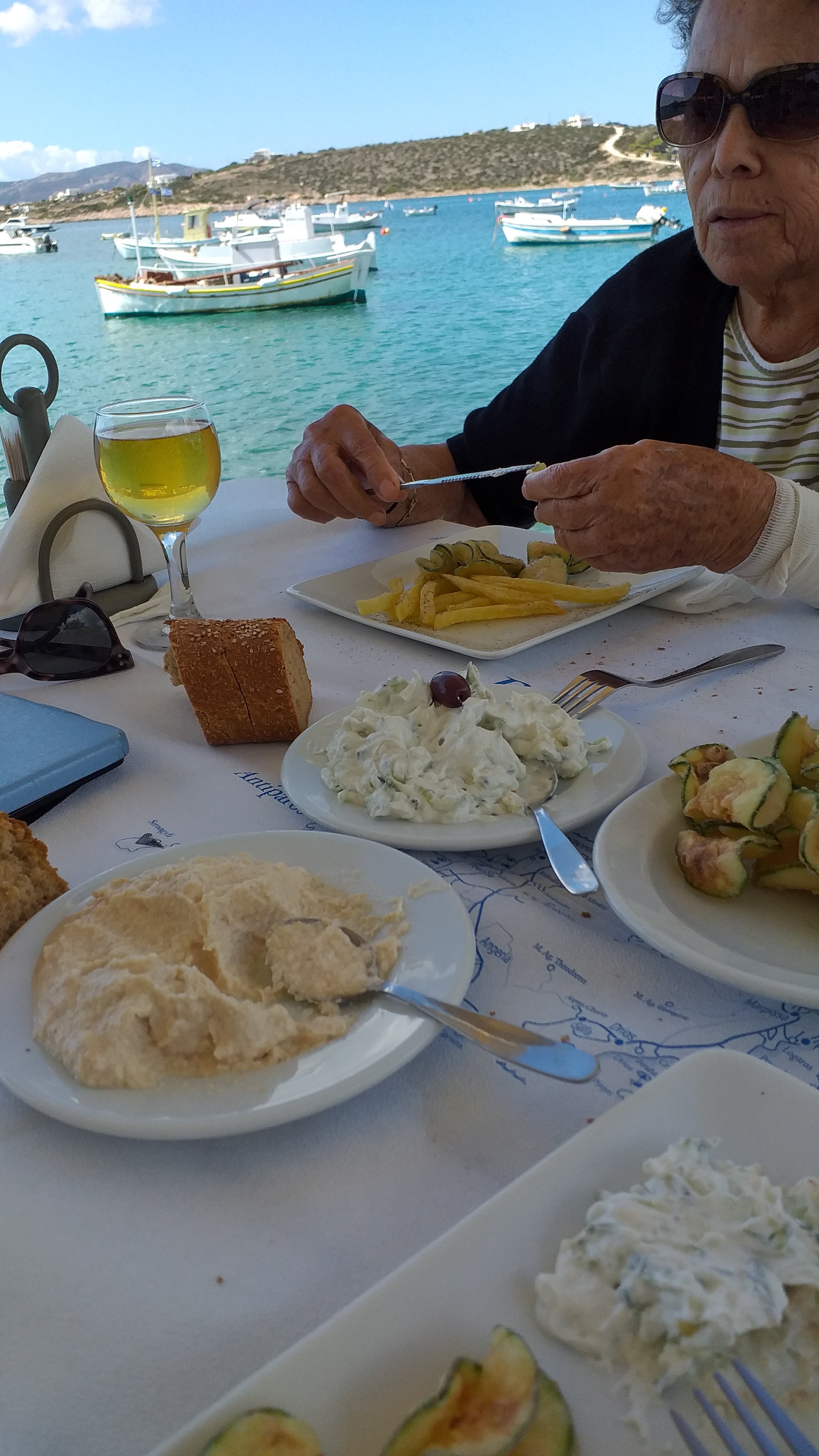 Twice a week I bring mom up to my place for a visit. Twice a week or so I have lunch or dinner at mom’s. Every now and then I meet friends for a coffee somewhere. This last week Lainee and I had breakfast at an outdoor cafe and on Sunday I went to Alyki with mom for a swim and lunch. Its a little custom mom and I started a few years ago: lunch, just the two of us, at Alyki. A taverna right on the water. Just the way I like to eat: tzatziki, taramosalata, fried potatoes and fried zucchini. Yum.