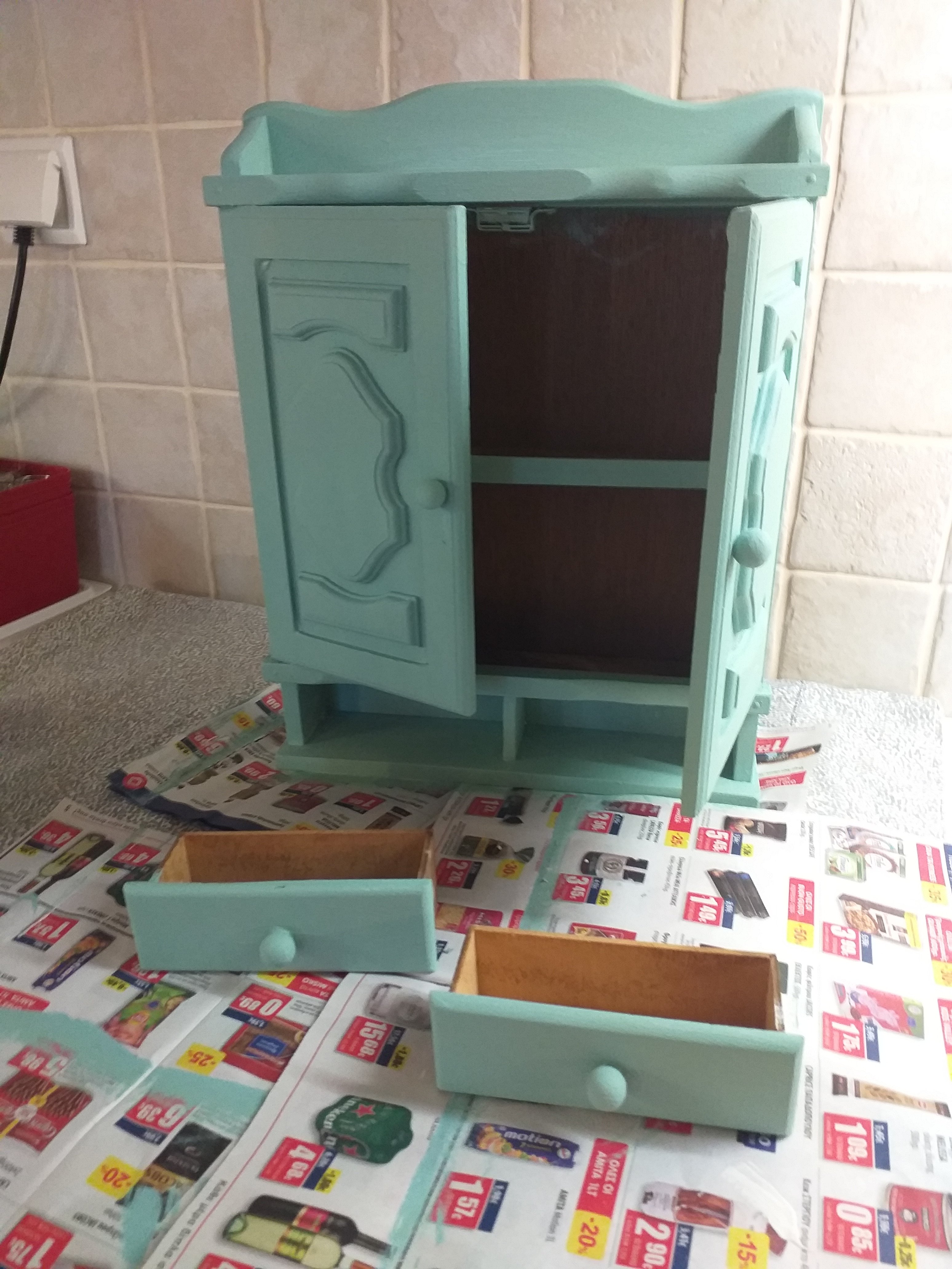 It has sat, unused, for years in mom’s kitchen – most bottles empty and some with very sad, old spices still in them. While I was sorting out stuff in mom’s house in Athens I mostly ignored it, then at the last minute I tossed it into my car to bring to Paros. I’m rather glad I did. I had some leftover chalk paint which I tinted into a darker version of my favourite green – and voila! New spice cabinet for me.