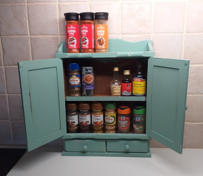 Dad had bought this little spice cabinet way back in the late 70s. It was all dark wood and contained 12 glass bottles and labels so you could organise your spices nicely.