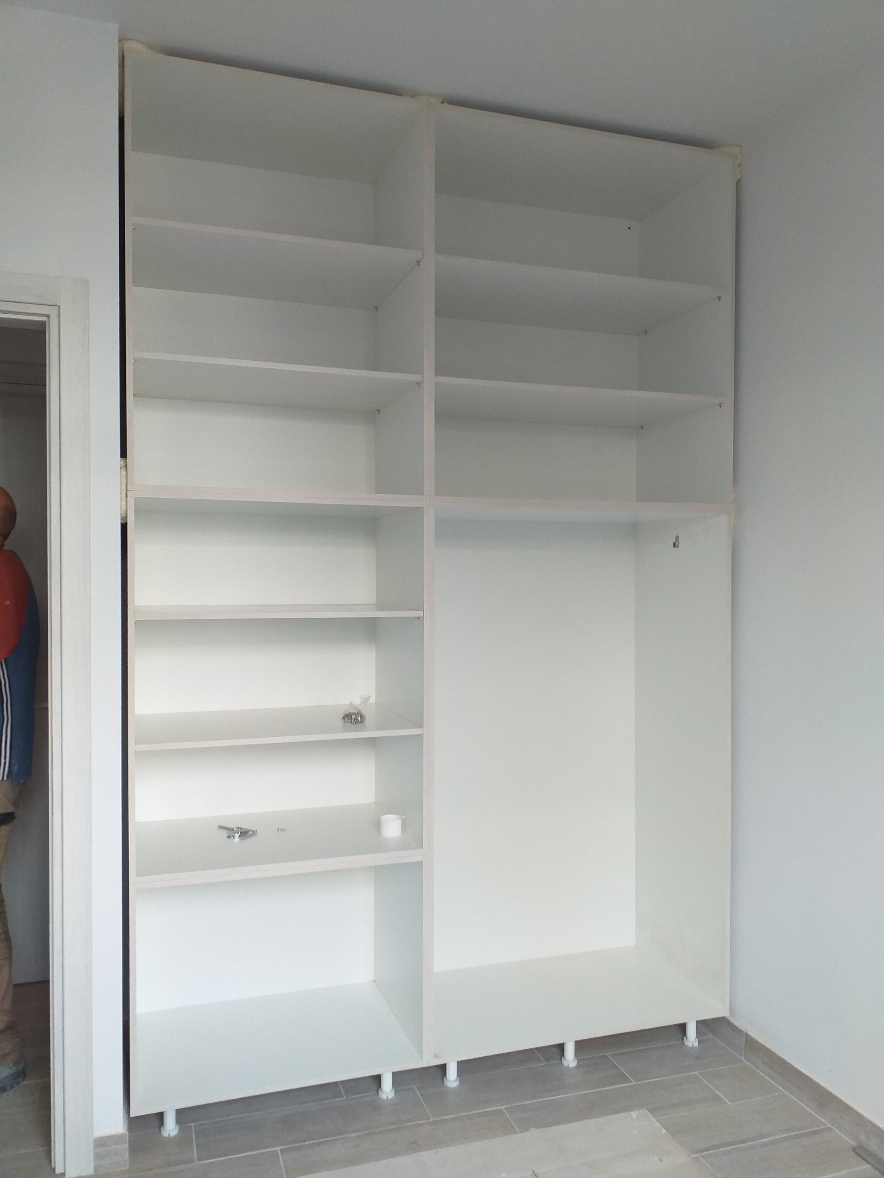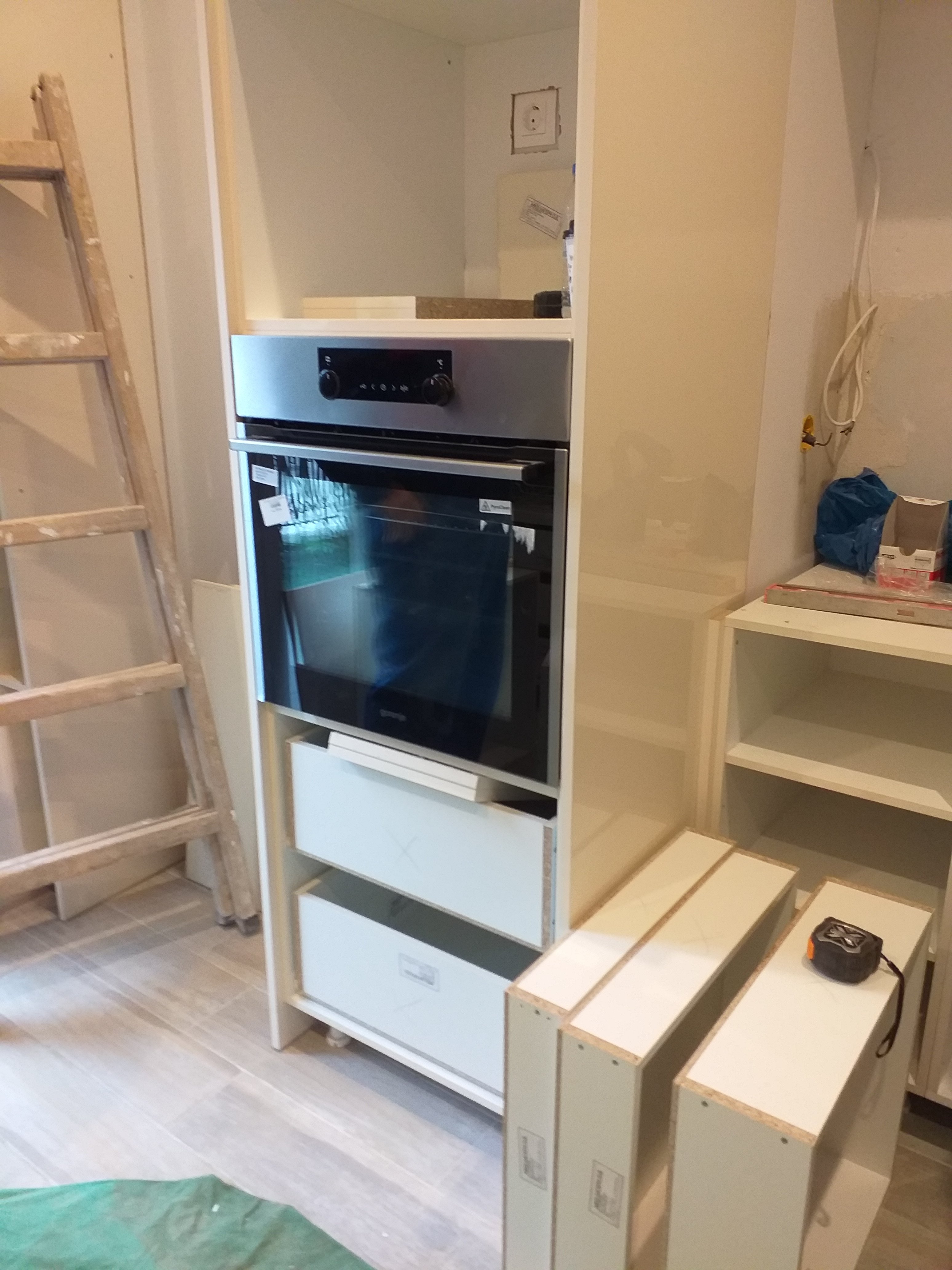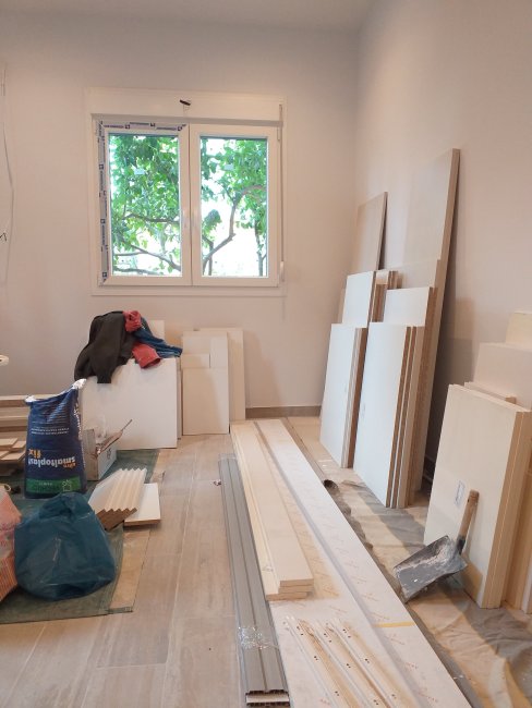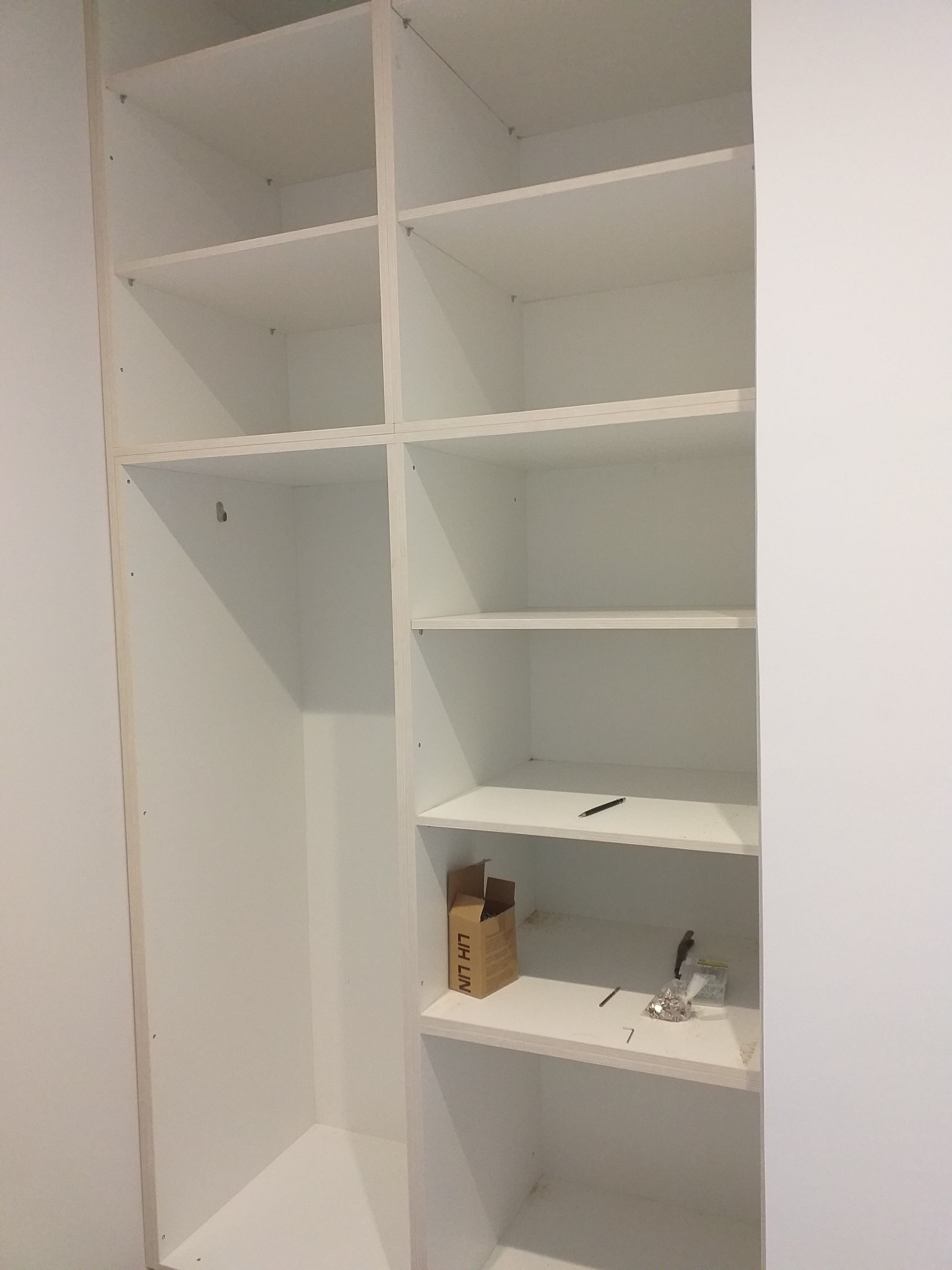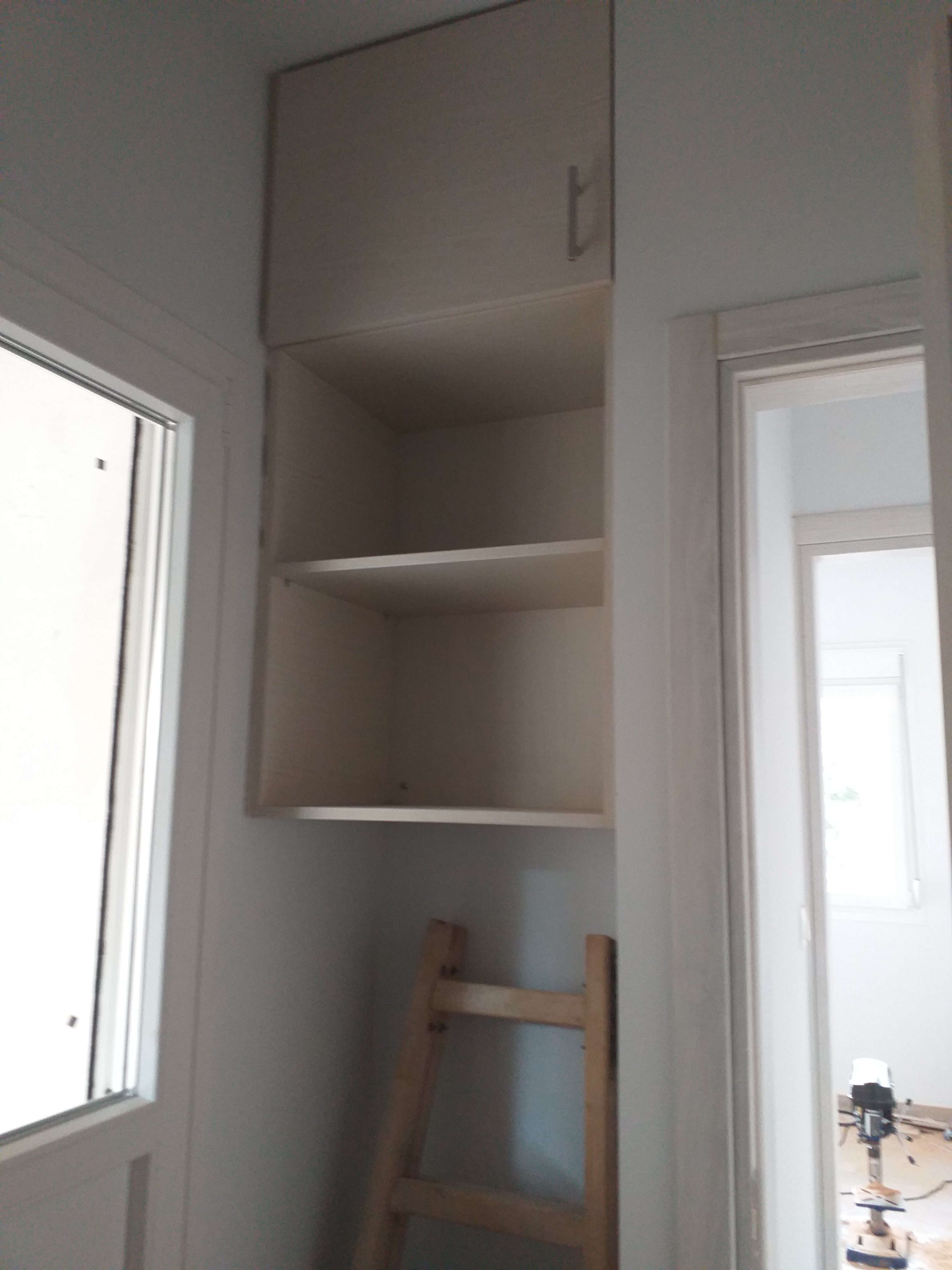 We have a window in the main bedroom finally. And all flyscreens are in.The wardrobe in the main bedroom.The wardrobe in the tiny bedroom.A small cupboard in the tiny bedroom.The kitchen taking shape.The oven is in!