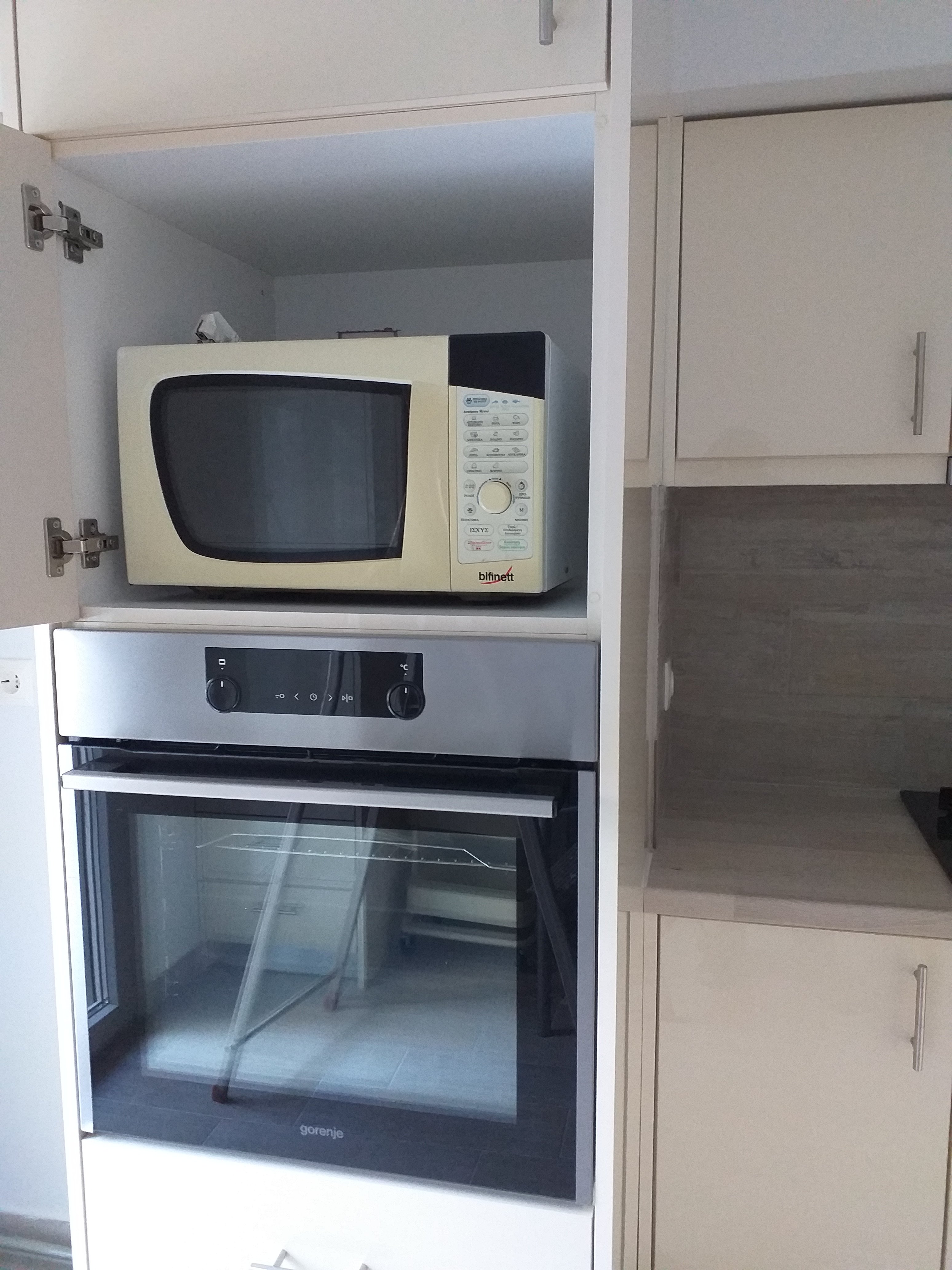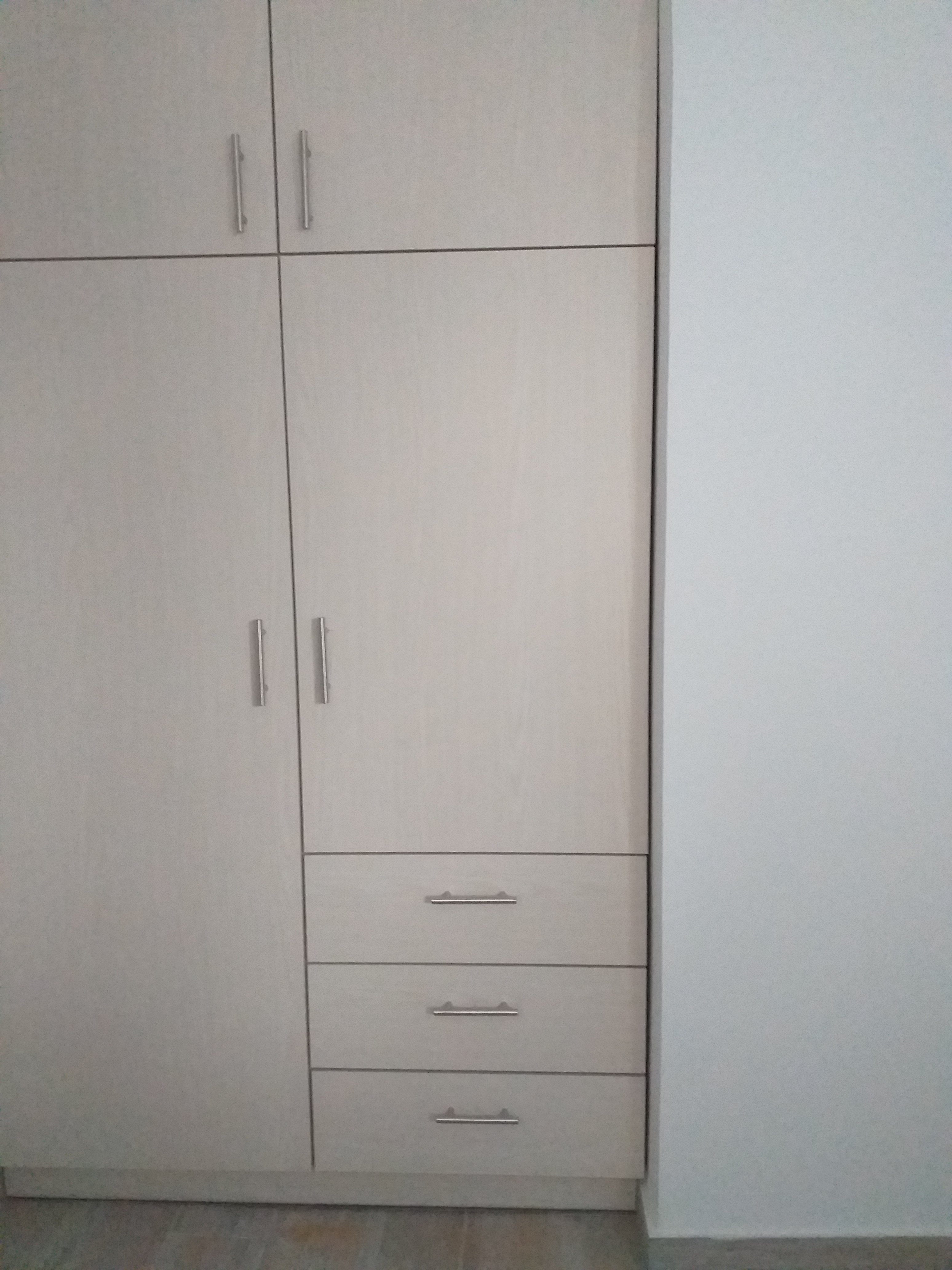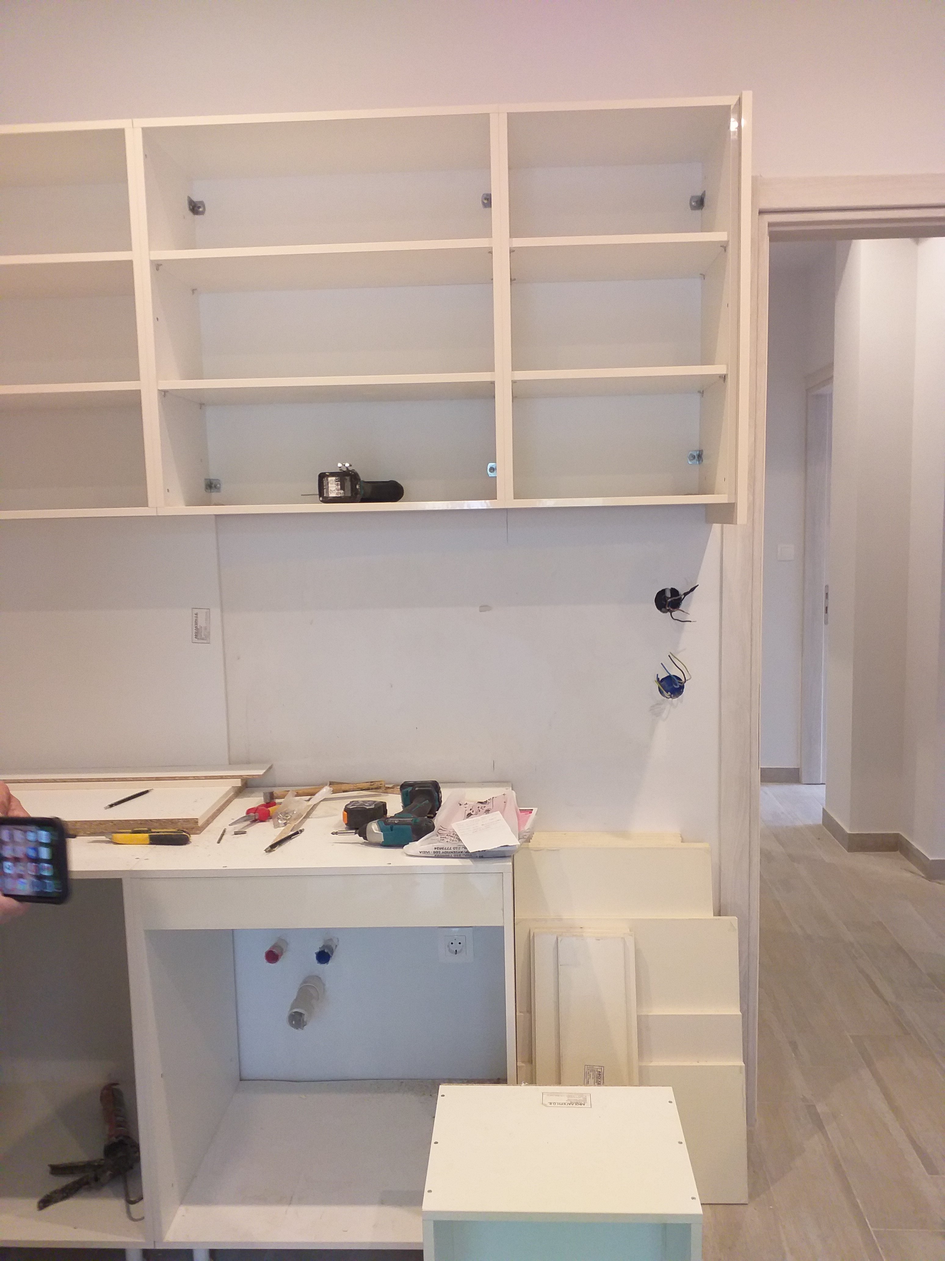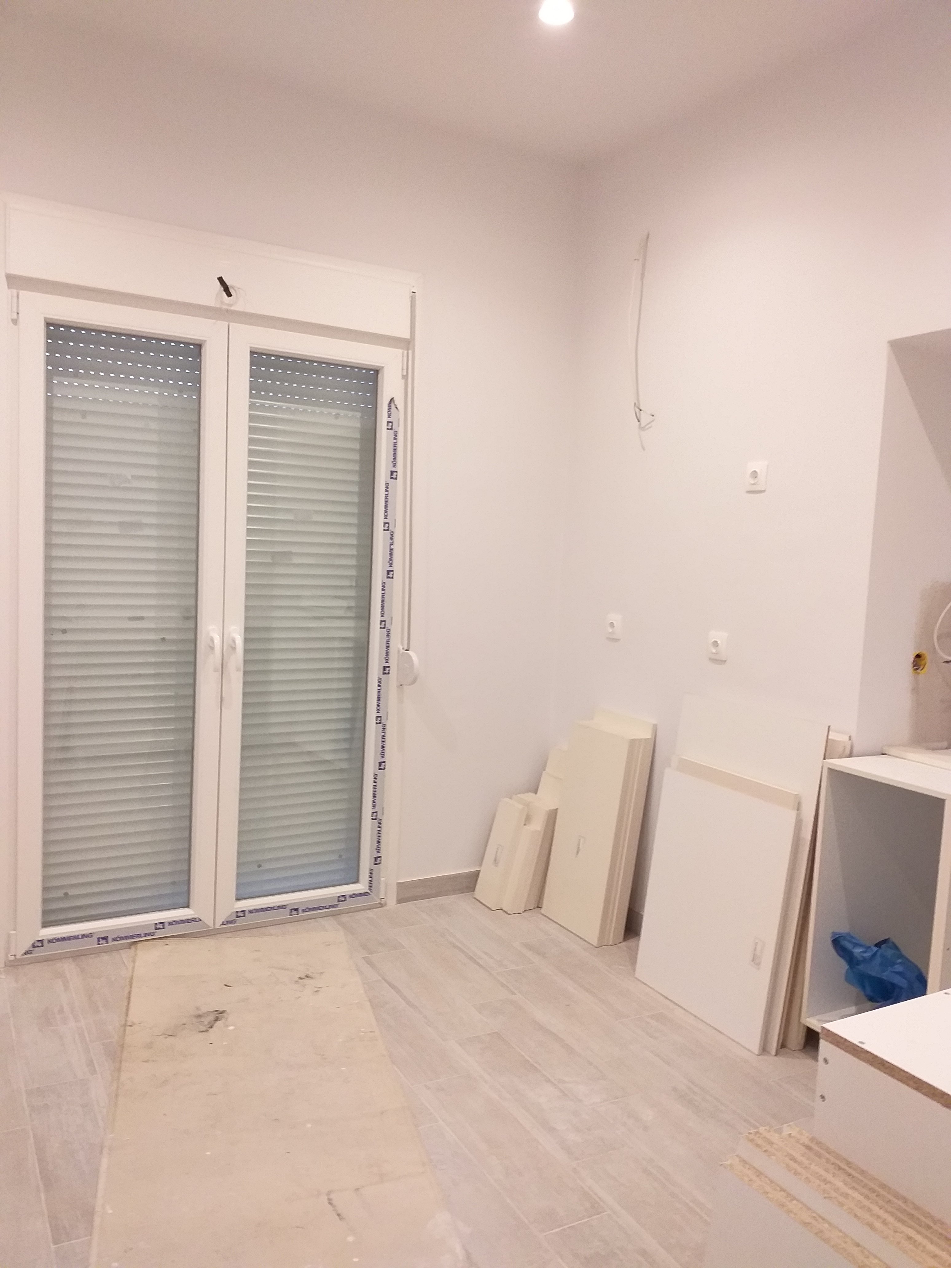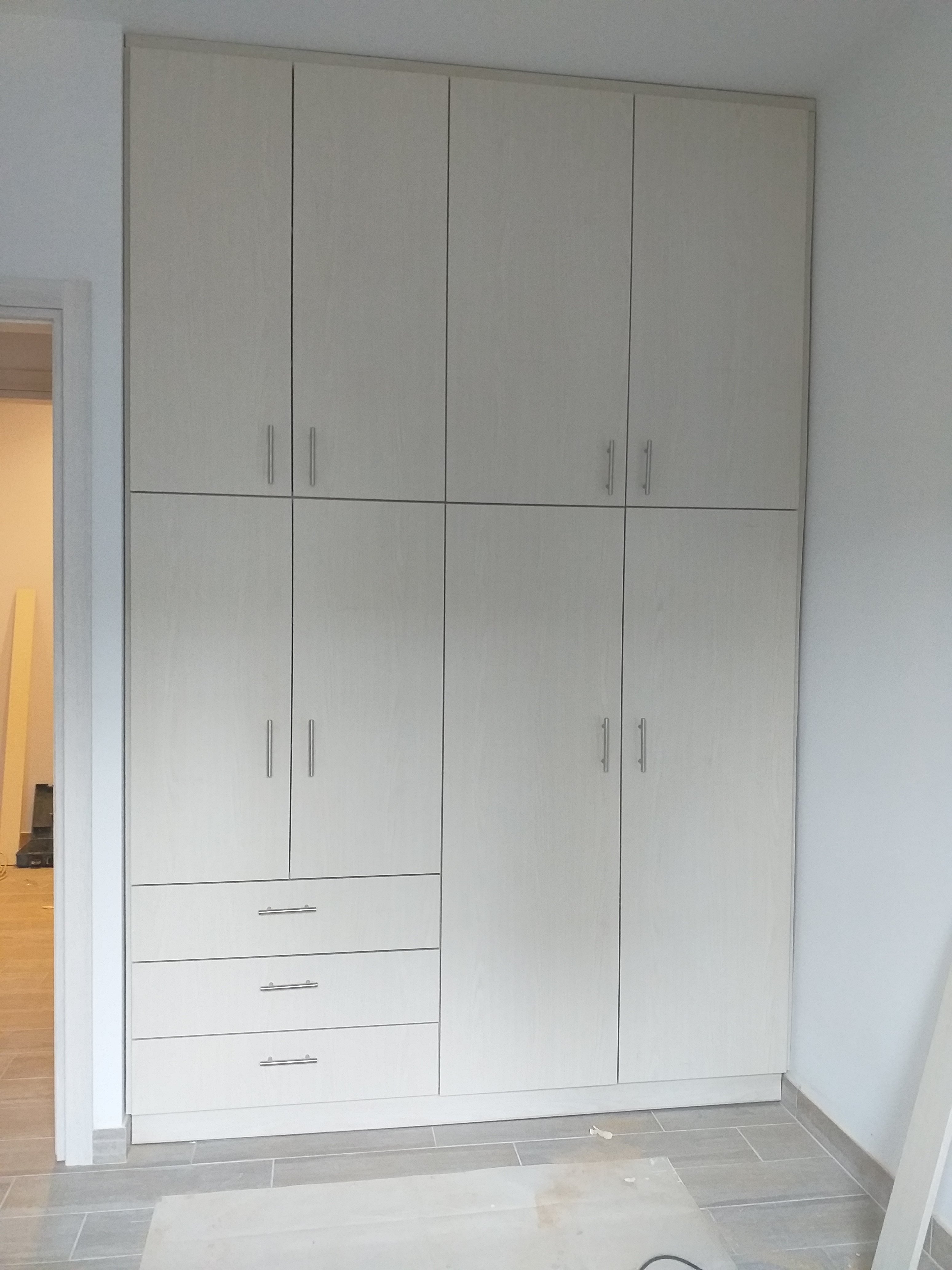We have a window in the main bedroom finally. And all flyscreens are in.The wardrobe in the main bedroom.The wardrobe in the tiny bedroom.A small cupboard in the tiny bedroom.The kitchen taking shape.The oven is in!